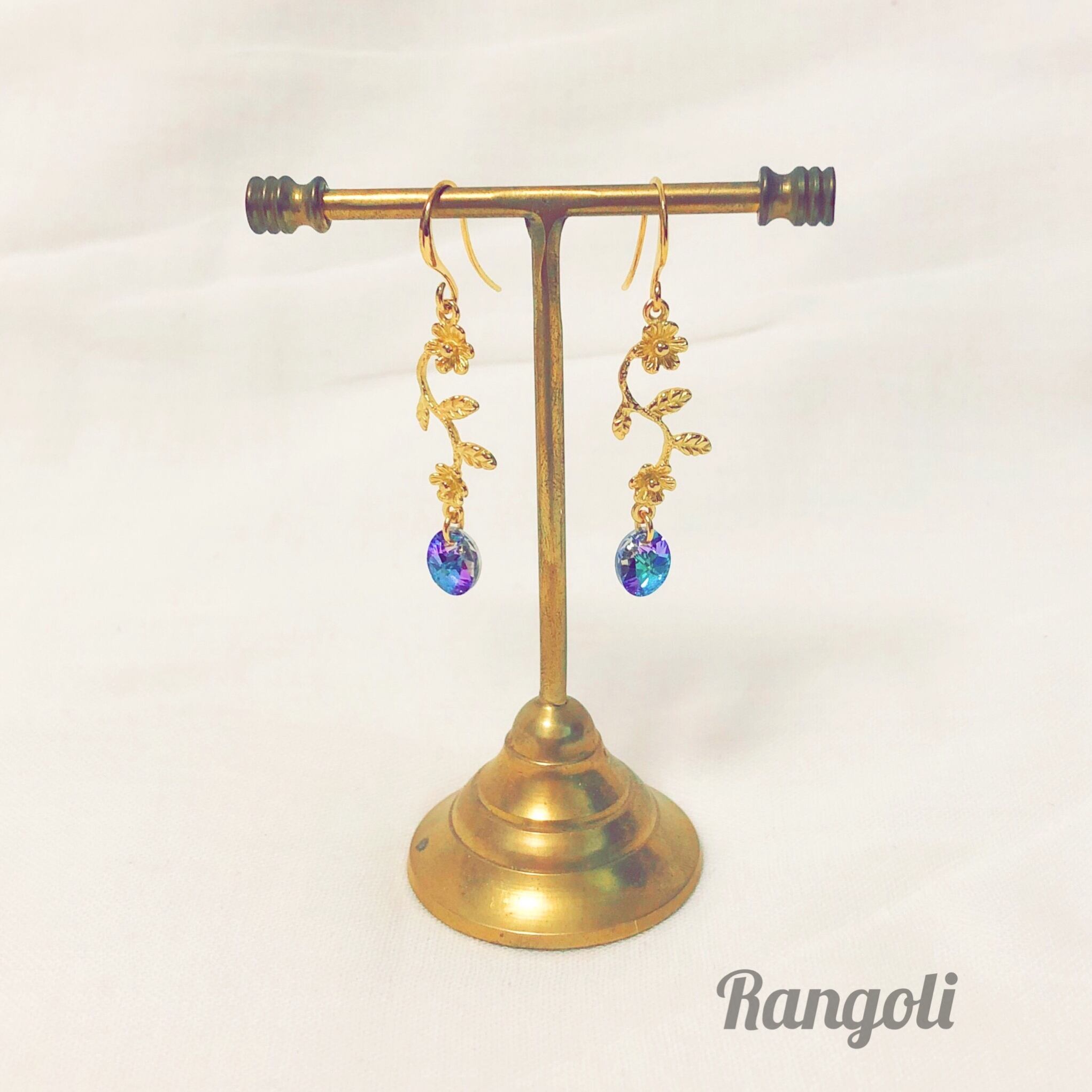 お花のラインパーツに、紫〜ピンク〜ブルーに輝くスワロフスキーをあしらったシンプルなピアス。