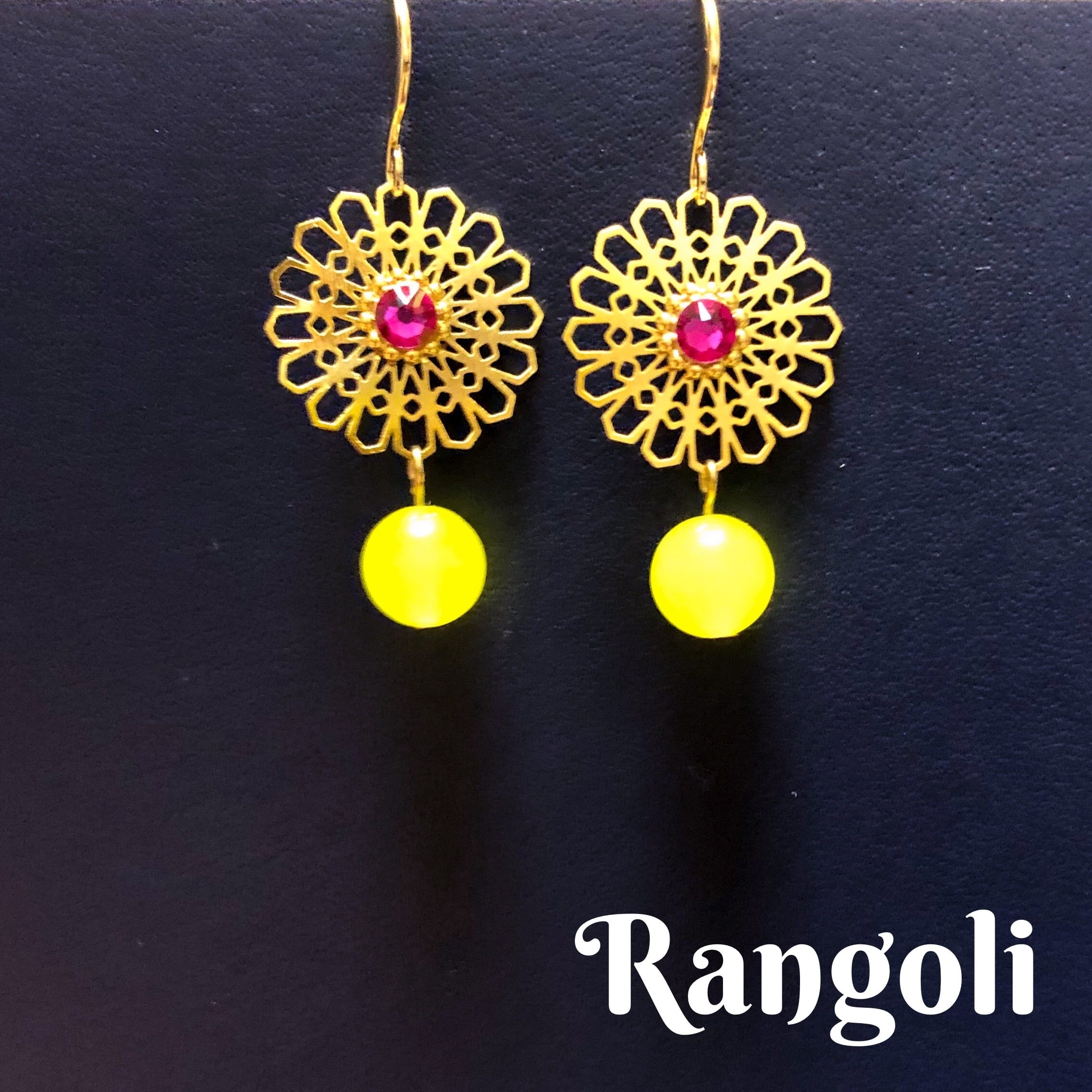 マンダラを思わせる透かしパーツにカラーカルセドニーを合わせたピアス。