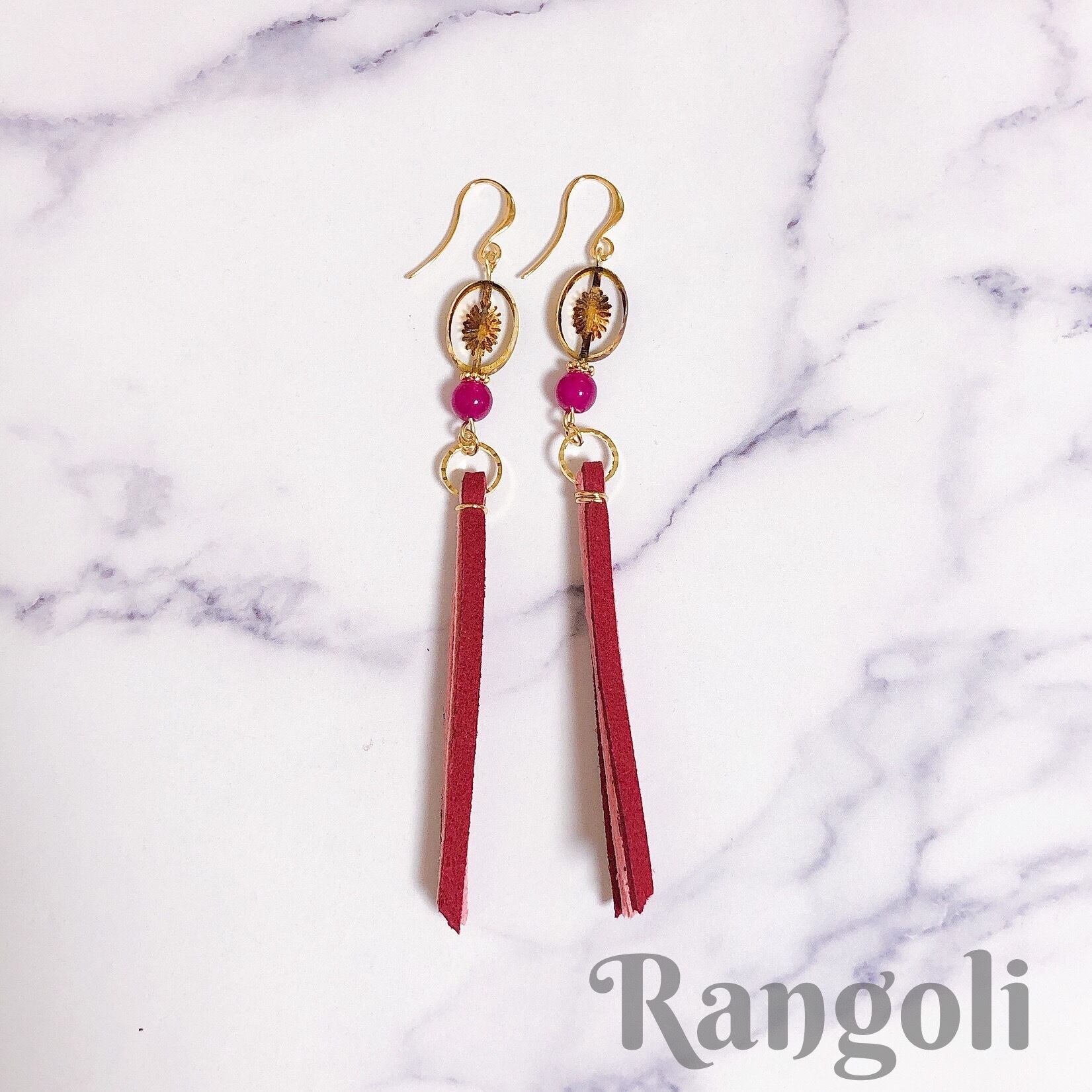 オーバル型チェコビーズと細身タッセルのピアスです。
