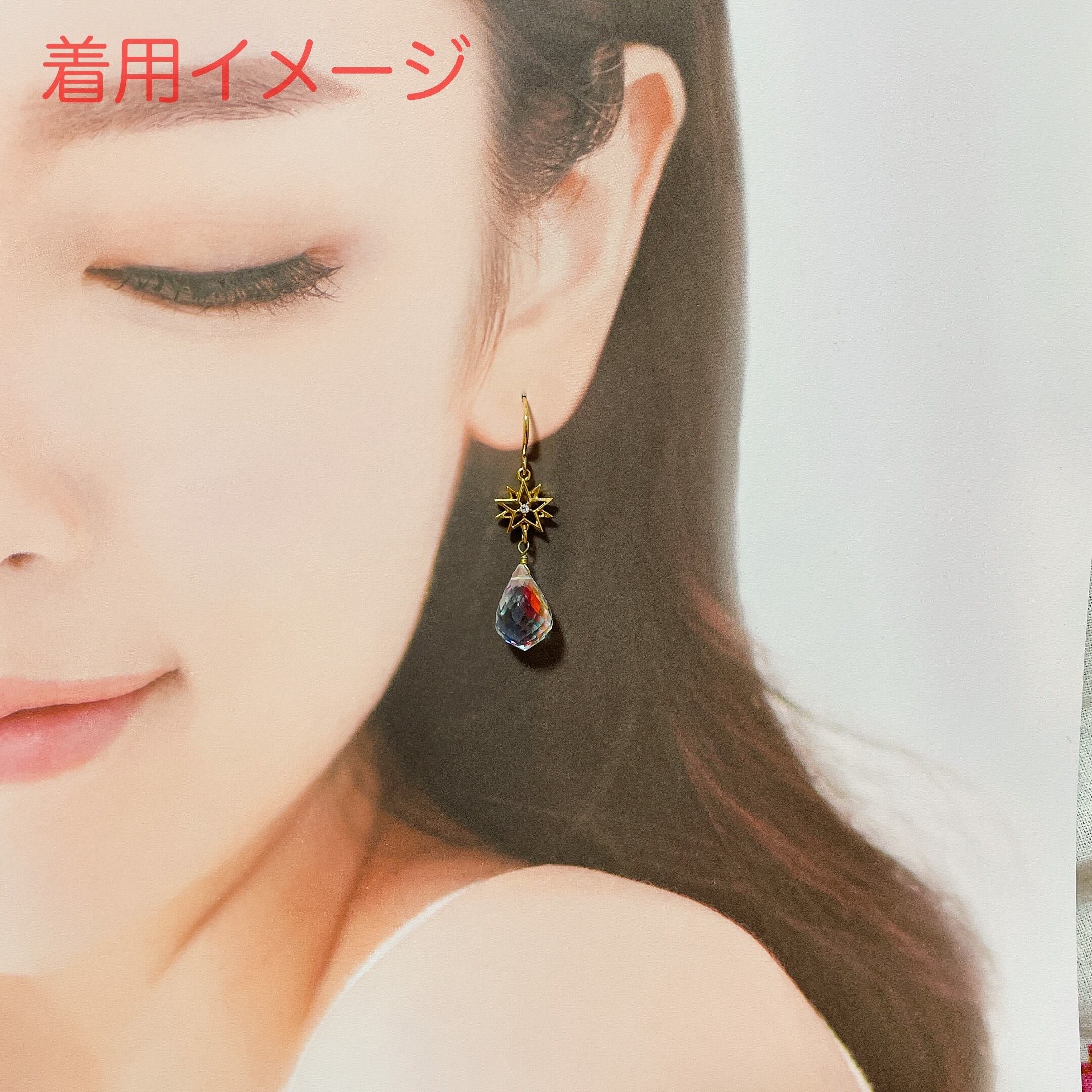 虹色に輝くファイアーレインボークォーツと、星形チャームのピアス。