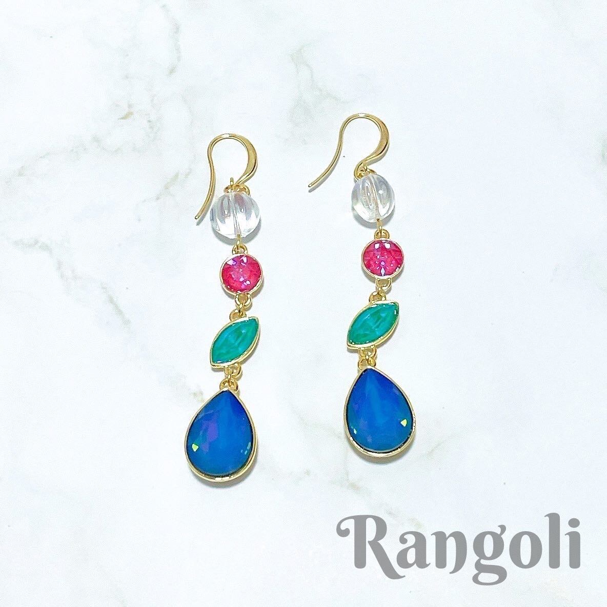 カラフルなスワロフスキーを繋いだピアス。ホワイトオパールヘリオトロープカラーが深みのある輝き。